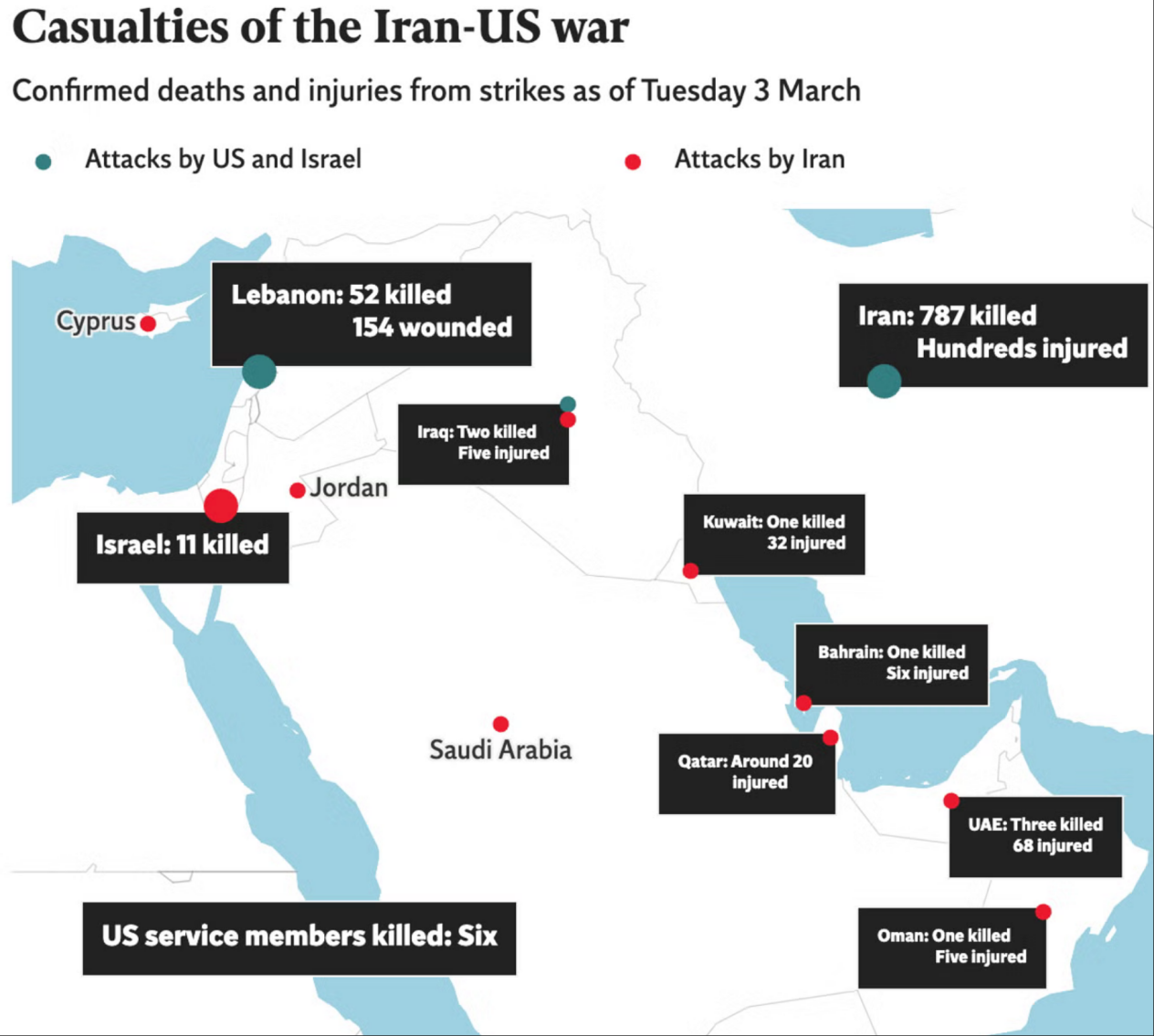 3月初,伊朗抵触以来战役涉及区域已清晰计算到的伤亡人数。图源:Independent